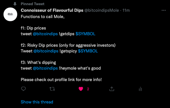 Why are Mole’s suggestions really low? This happens when the crypto has pumped significantly in the last two weeks (and could be still pumping), so statistically significant dips are soooo far away. In this case, you may try $getspicy instead of $getdips. As stated in the warning above, it’s pretty aggressive. But it’s up to you.